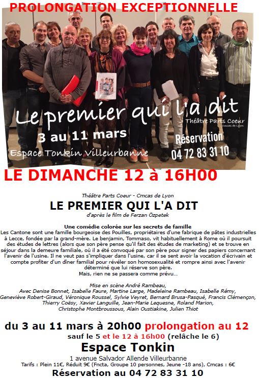 La pièce "Le Premier qui l'a dit" du Théâtre Parts Coeur dont deux de nos éminents membres sont des acteurs actifs, joue sa pièce encore peu de temps mais surtout fait une prolongation exceptionnelle ce dimanche 12 Mars 2017 à 16h (voir l'affiche). Il parait que c'est très sympa...