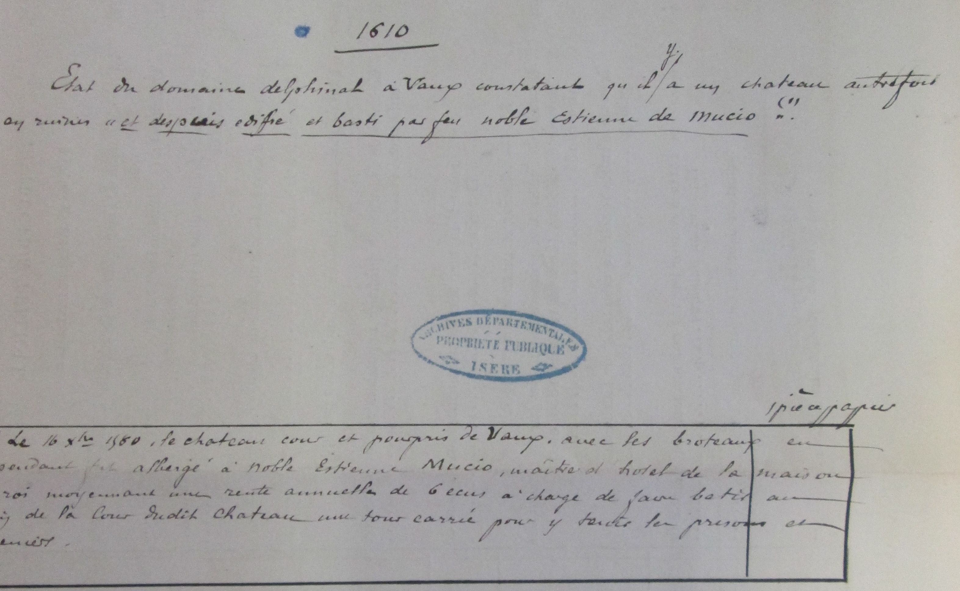 La déception est grande. Toutefois, je n'abandonne pas. Je fais une recherche sur De MUCIO, puisqu'il semble que le château a été détruit en 1610 et donc reconstruit par ses soins. Me voilà donc faire une nouvelle recherche dans ce sens. En effet, cette archive existe bien :