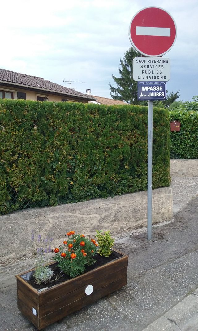 Rue Jean Jaurès, au niveau de l'entrée de l'impasse Jean Jaurès, notre trésorier adjoint, Bernard, vient d'installer 2 belles jardinières, fleuries par ses soins, arrosées par lui (et bientôt par le lotissement en roulement).