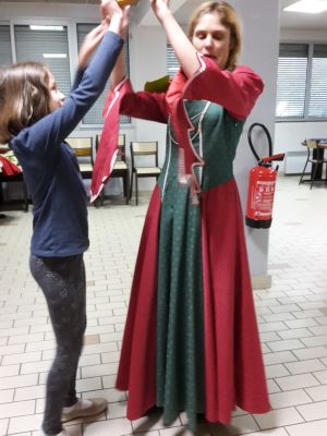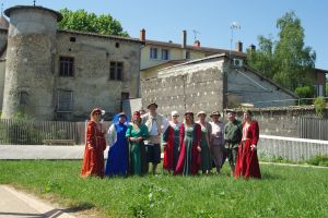 C'est ainsi que les seigneurs arrivent au repas sous le son des trompettes. Un grand merci aux Pennons de Lyon/compagnie du chemin de Vienne qui sont venus nombreux, costumés, à la fois en tenue de servante, et en tenue d'apparat, et au trompettiste du conservatoire pour s'être prêté au jeu !