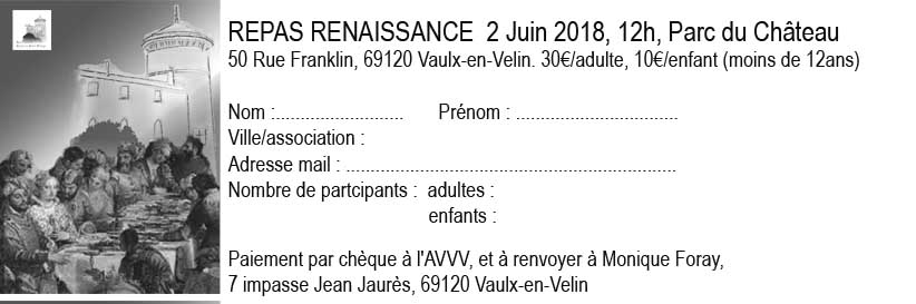 En partenariat avec les PENNONS de Lyon, et d'autres associations, nous organisons dans le parc du château un repas style Renaissance, avec costumes (pour ceux qui veulent) et de nombreuses animations dont nous vous réservons la surprise.