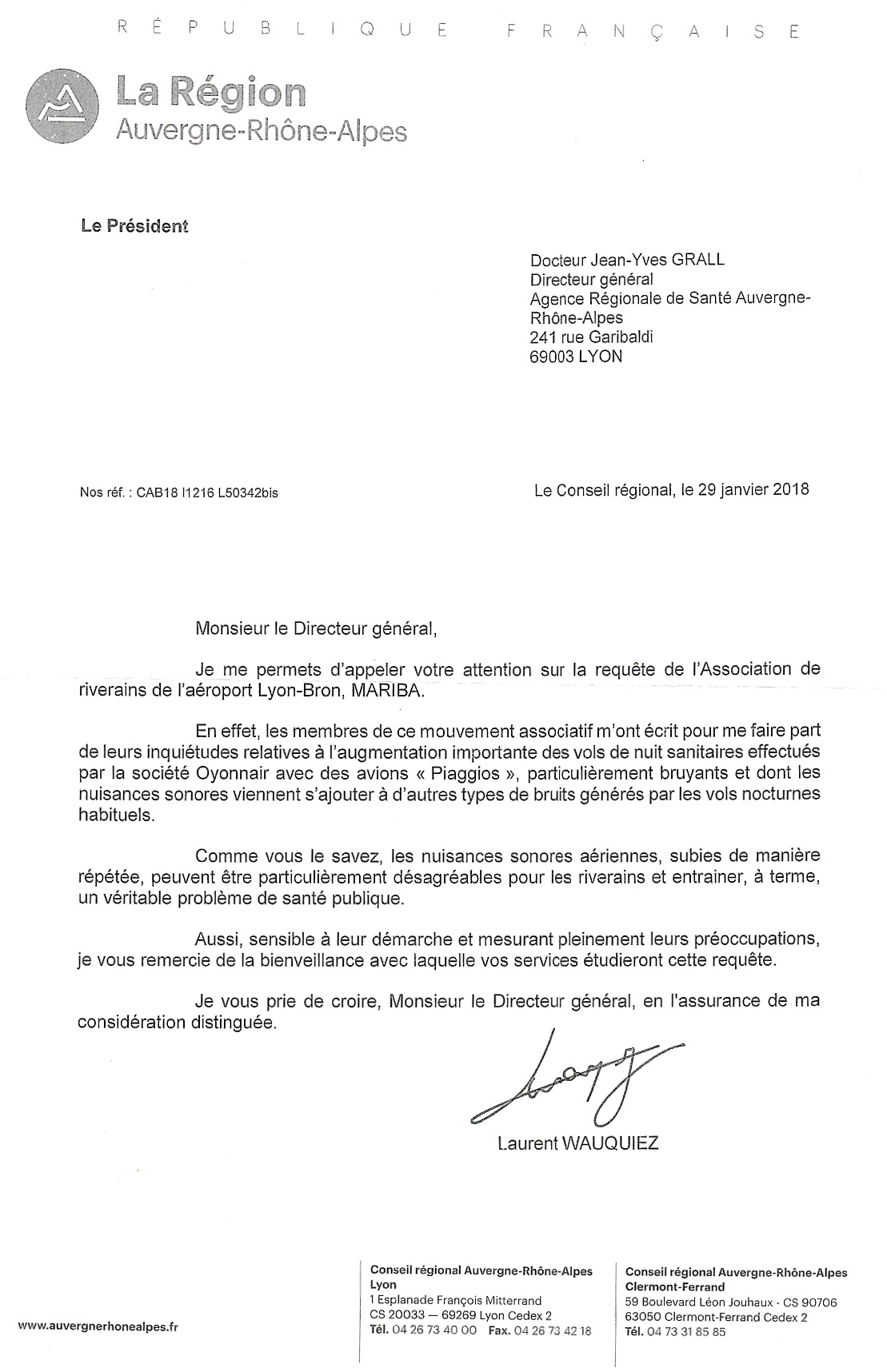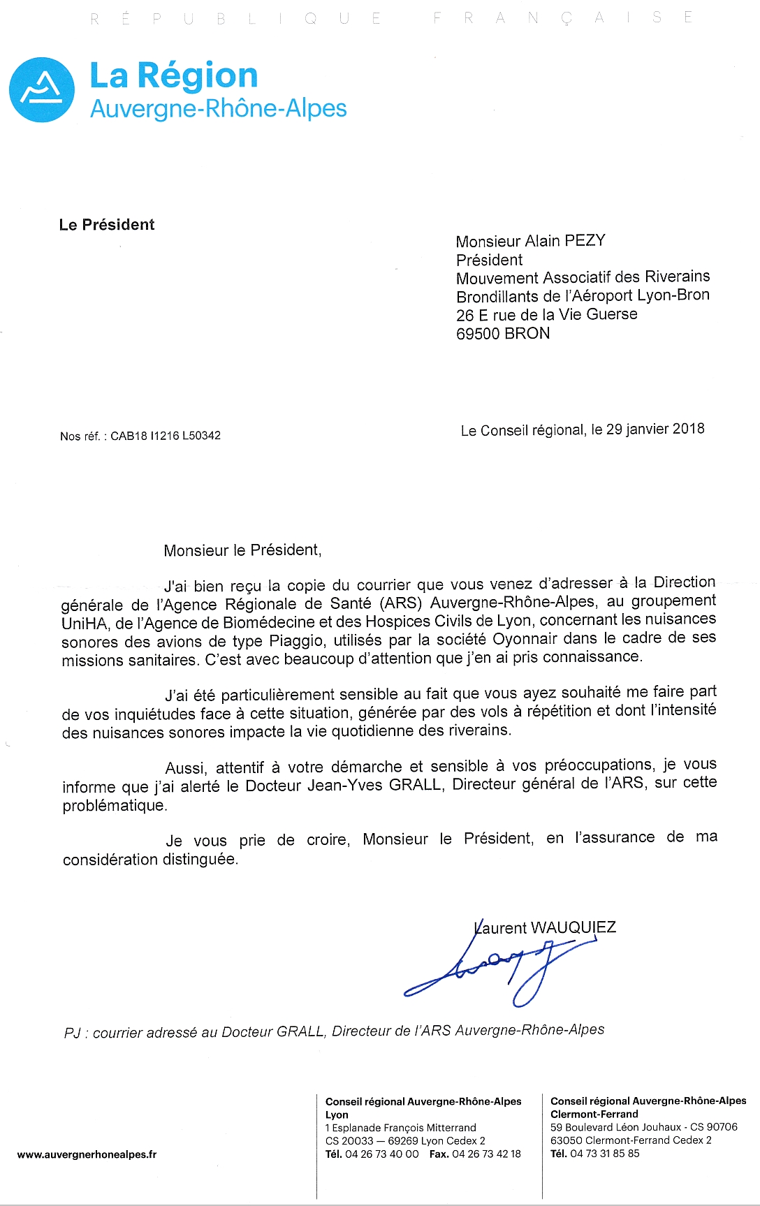 Samedi nous vous faisions part de l'envoi d'un courrier au directeur de l'ARS au sujet du bruit des avions en approche ou au décollage de l'aéroport de Bron, et plus particulièrement au sujet du Piaggio qui est très bruyant.