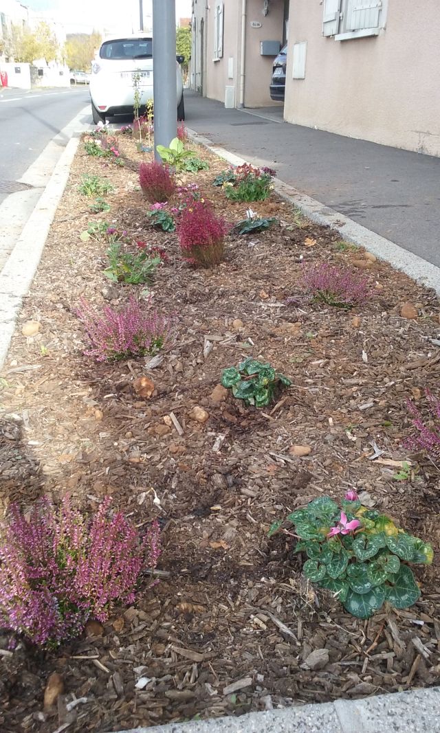 Il y a quinze jours nous étions donc une douzaine à nous saisir de piochons, de binettes, de bêches et d'arrosoirs pour planter trois nouveaux massifs (deux rue Louis Duclos, un rue Jean Moulin) et en améliorer encore deux que nous avons crée il y a 18 mois.