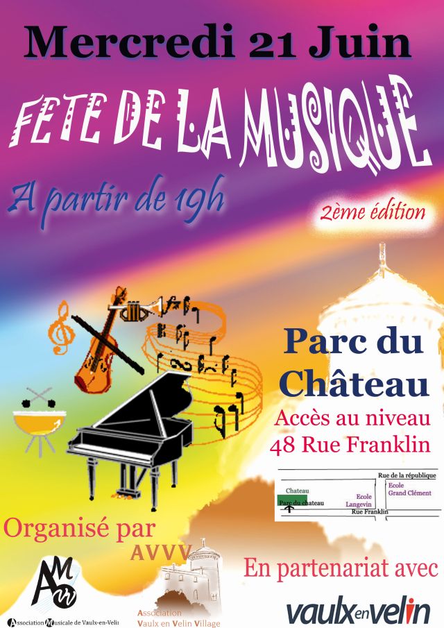 C'est ainsi que l'Association Musicale de Vaulx-en-Velin organise mercredi prochain 21 juin dans le Parc du Château la 2eme Fête de la Musique en collaboration avec notre association. Vous pourrez entendre la fanfare, de nombreuses chorales vaudaises, l'harmonie, et plusieurs autres ensembles musicaux. La musique sera très variée. Une petite restauration et des jeux pour enfants seront disponibles sur place.