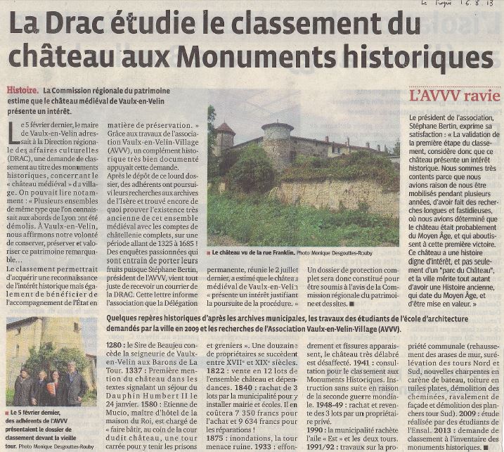 La DRAC (Direction Régionale des Affaires Culturelles) nous a écrit en juillet pour nous informer que le château du Village représentant un véritable intérêt elle allait lancer le dossier de classement de ce château comme monument historique. C'est donc une grande victoire pour tous les habitants du Village et pour l'AVVV car tous ensemble nous nous sommes mobilisés autour de ce classement et pour faire reconnaitre notre Patrimoine historique. Nous vous tiendrons informé de la suite du dossier et dans cette attente vous pouvez lire l'article de presse consacré à ce sujet (voir ci-dessous).