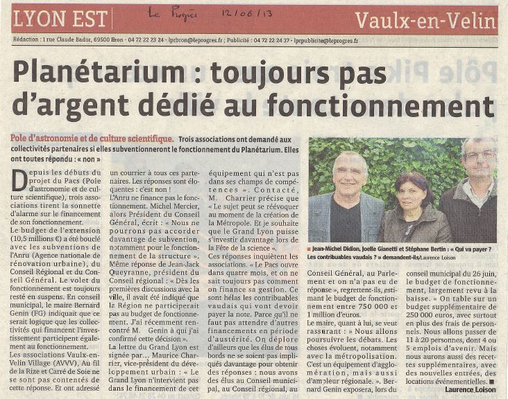 Les associations Au Fil de la Rize, Vaulx en Velin Village et Vaulx Carré de Soie ont questionné depuis décembre 2012 le Grand Lyon, Le Conseil Général, Le Conseil Régional et l'ANRU pour savoir si le budget de fonctionnement du PACS sera fourni en partie par eux comme suite aux engagements de M le Maire. Ils nous répondu en coeur : "NON" (voir courriers ci-dessous). Les 3 associations ont donc écrit de nouveau à M le Maire pour savoir où est-ce qu'il allait trouver l'argent? Nous attendons sa réponse.