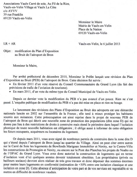En mars 2011 le conseil municipal de Vaulx-en-Velin votait le lancement de la révision du Plan d'Exposition au Bruit. Deux ans et demi plus tard : rien. L'enquête publique n'a toujours pas débuté. Le trafic des avions et donc le bruit augmentent jour après jour. Les constructions se font dans la nouvelle zone de bruit sans application des futures normes d'isolation au bruit. Quatre associations (Au Fil de la Rize, AVVV, Vaulx Carré de Soie, Association Vaulx la Côte) se sont donc réunies pour écrire à M le Maire afin de lui demander de relancer le processus de révision du PEB, et, en attendant, de suspendre les signatures des permis de construire dans la zone soumise aux futures restrictions d'isolation (voir courrier ci-dessous).