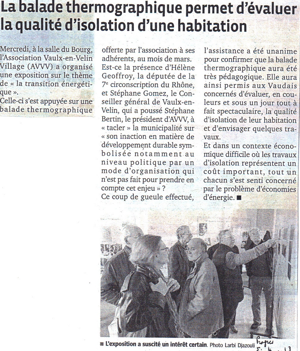 L'exposition qui rendait compte de la balade thermographique infra rouge dans le Village s'est déroulée mercredi 3 avril à la Salle du Bourg en présence de Mme Geoffroy Députée de la circonscription et M Gomez Conseiller Général. Plus d'une cinquantaine de personnes avaient répondu présentes. Les résultats étaient très visuels et les pistes de progrès nombreuses. Tous ont convenu de se retrouver l'an prochain pour analyser les maisons non encore vues et approfondir celles déjà thermographiées. Ci-dessous quelques photos et l'article du Progrès sur le sujet.